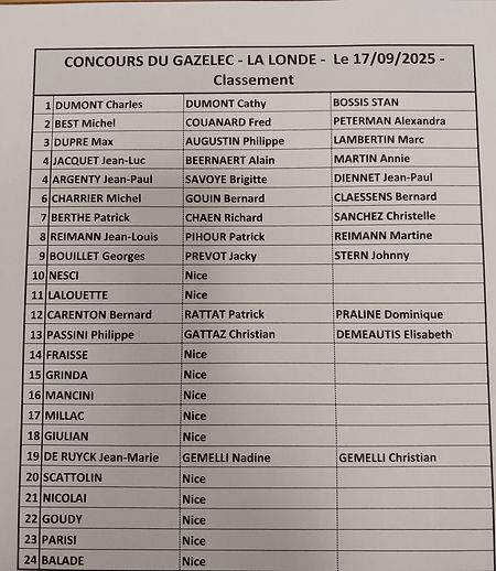 Mercredi 17 septembre 2025, s'est tenu le match retour 2025 des rencontres qui opposent chaque année le Gazélec de Nice à la Boule Londaise. Cette journée a été un vrai succès : le soleil a accompagné les joueurs, le repas (couscous) concocté par les bénévoles sous la houlette du président a été très apprécié. Sur l'aspect sportif, les londais ont été à la hauteur : 12 équipes de chaque club se sont amicalement affrontées sur 4 parties. Les équipes londaises ont pris les 9 premières places alors que la première équipe Niçoise se classait en 10ème position. Nous nous retrouverons au printemps prochain pour l'édition 2026.